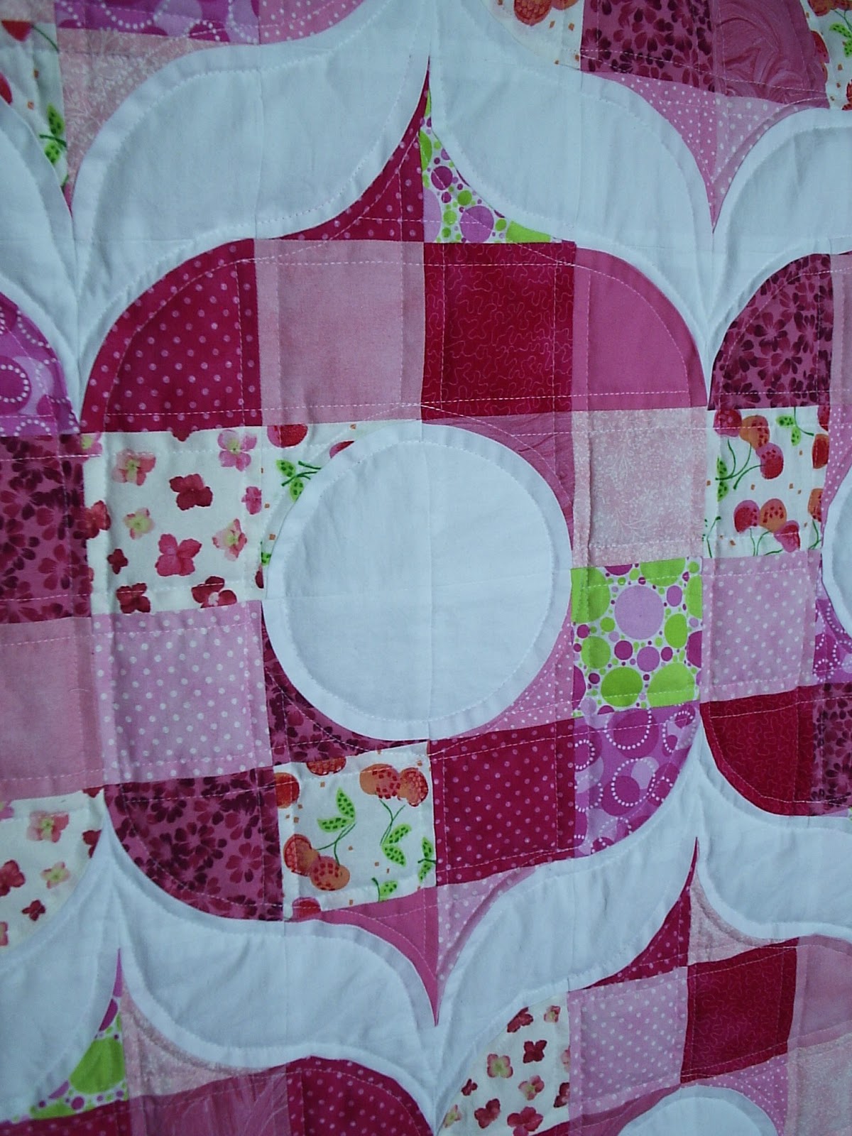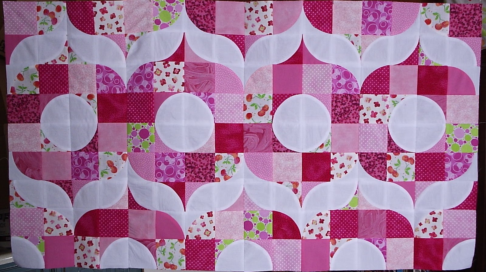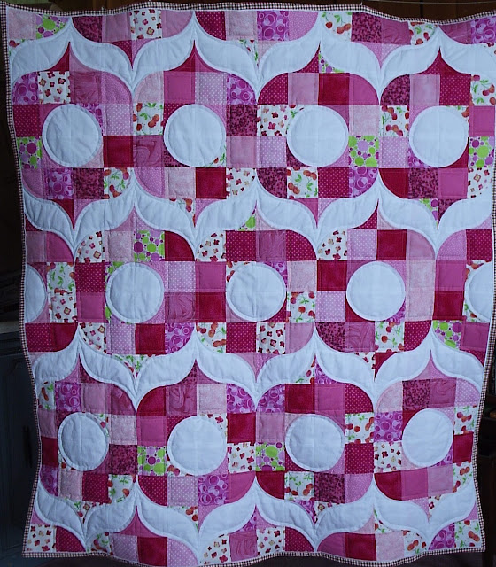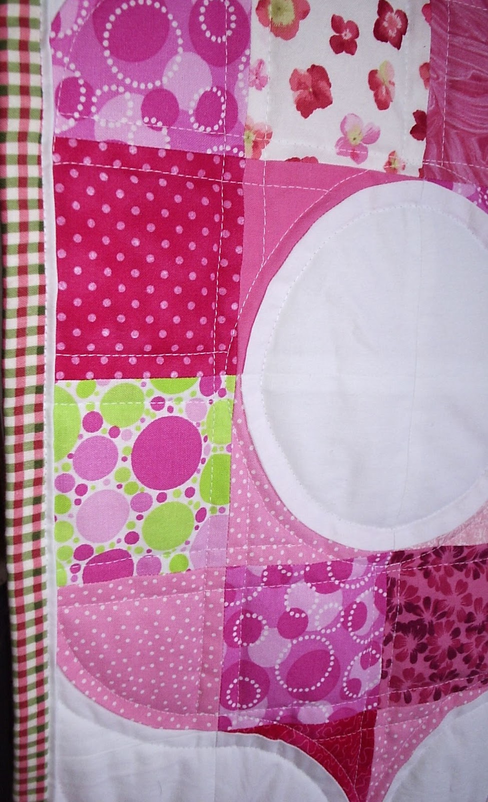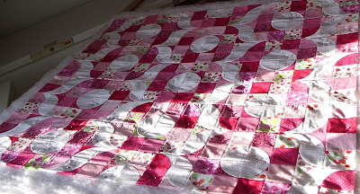 Now I am stumped... What to choose for binding? I thought of using a grey with white polka dots, which ties in with the backing, but it doesn't stand out much. I thought of using a black and white stripe. I even thought of using a green with white polka dots to pick up on the bit of green that is found in some of the fabrics in the top, but it looked very Christmas like with the darker pinks.