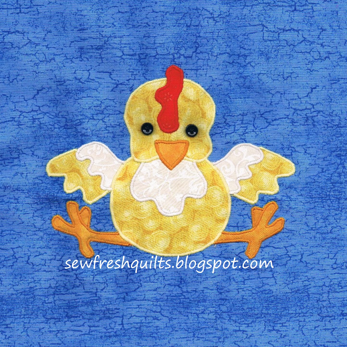 But I did have two leftover chick blocks and two feather blocks. I had the fabric pieces fused on the blocks, but had not yet satin stitched around the pieces. I did that this afternoon. And then I made myself happy by sewing those little mini buttons onto those two chicks.