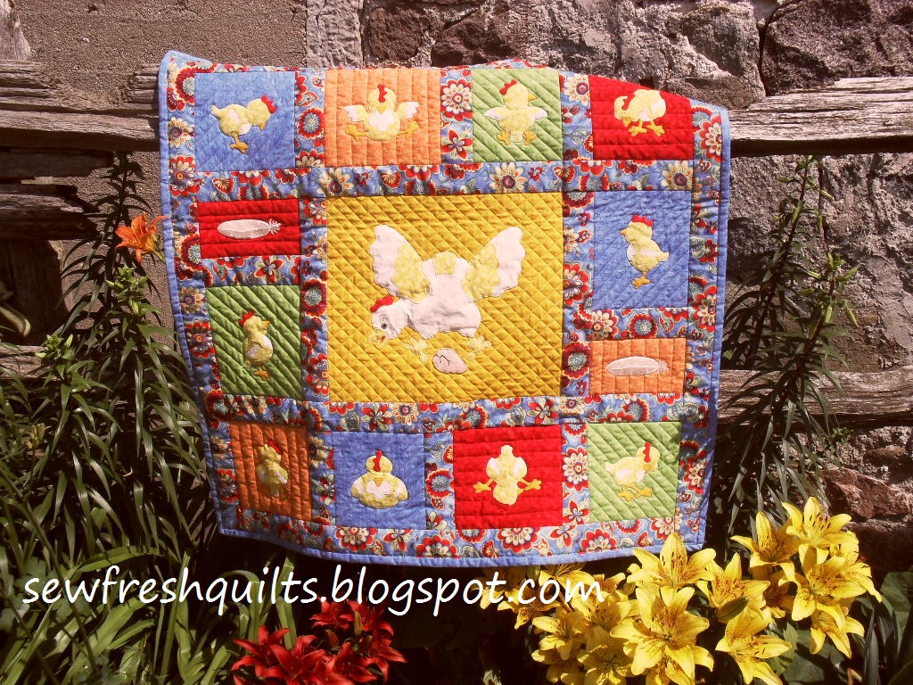 Today I got out what may be considered a UFO. It was only waiting for some eyes.... I made this little quilt before winter - quilted and bound even. So it is really a weird UFO. The only thing unfinished were the little chicks eyes.