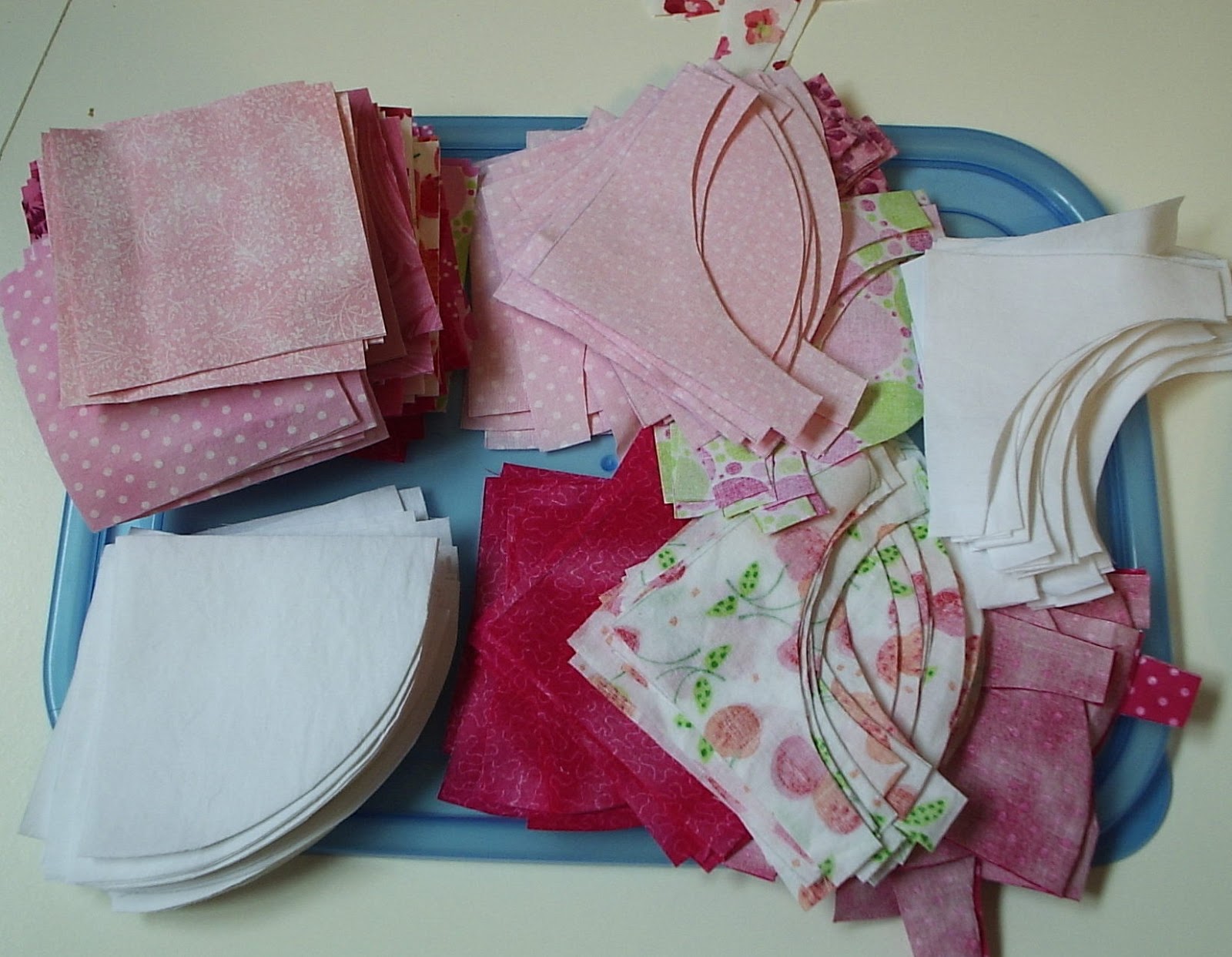 The crib quilt will be using about 12 different pink fabrics from the 'stash' and accented with white. I spent the whole afternoon tracing templates and cutting pieces, counting, figuring and looking forward to tomorrow. When I will get to SEW!