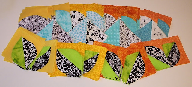 I have been busy working away on the Flowers in the Sun quilt. All of the strips were cut. The templates were traced and the curved pieces cut out. The curves have been sewn. And all those blocks were trimmed square. All the HST's were assembled. I have finished making the total 192 - 5 1/2" squares, which make the 12 flower/leaf blocks. Here is that pile o'fabric!