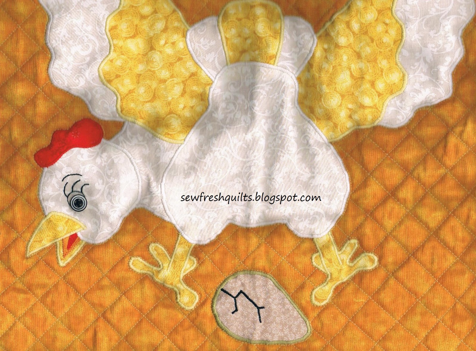 Sew I got out the embroidery thread and satin stitched some little eyes on those chicks - hiding the knots just like you would thread ends while quilting. And I took off the hen's crazy looking eye and satin stitched one on for her, too.