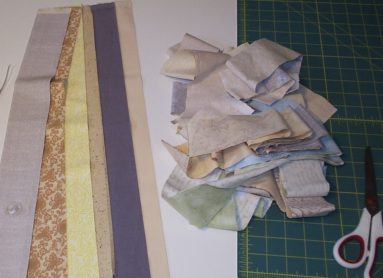 I chose all the fabrics to be used in the scrappy neutral background - 22 of them. Included four light 'coloured' strips just to jazz it up a bit. All beige and grey seemed little boring to me. And lined up the strips in a row to get a feel for the order. Called my son for his opinion. Any that look like they should not be included? Should they be rearranged?