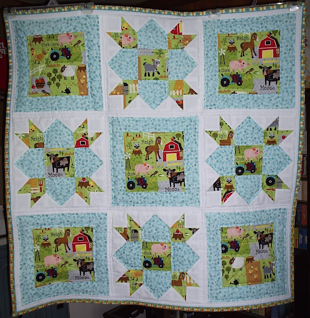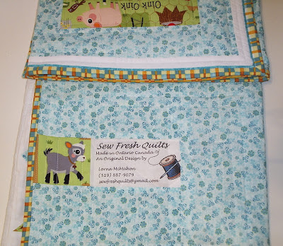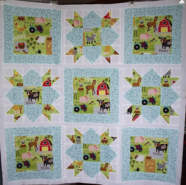 Finally decided to go with the blue fabric used on the blocks and am sew happy I did. Much sweeter! And I love the little goat pieced in with the label. He's a keeper!