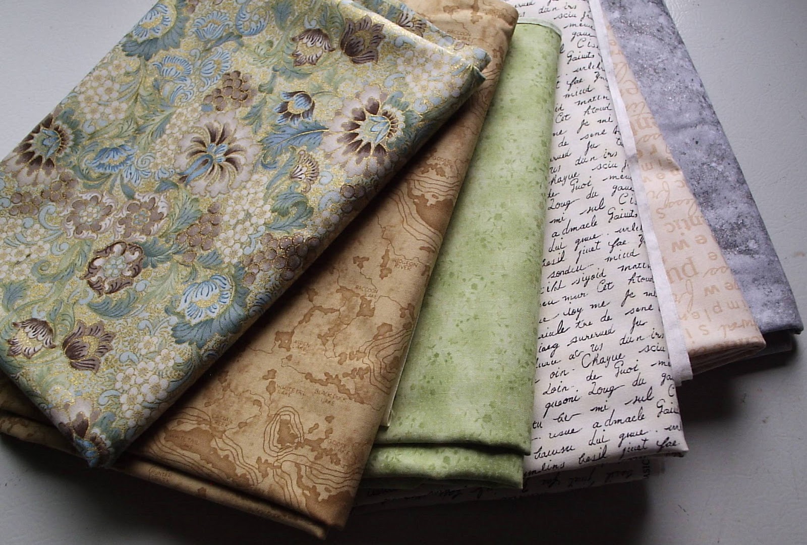Here I found some great additions for my neutral background - from right to left - a grey, shimmery stone-like fabric, some text prints, a light green I could not resist, and a map layout found on the clearance rack. I was satisfied with my find! Went to the cutting table, which was unmanned - or womaned..... And it was there that I found the beauty on the left. Expensivest fabric I ever let myself indulge in. It went against everything I was raised to live by concerning expenditures.... But it didn't take me long to decide that no matter the cost - that fabric was going to tie it all together. Fill in the negative space, go with the blue and green cool colours of the block AND go nicely with that negative background without becoming one itself! Besides it matches the light green fabric that I could not resist! And I DESERVE it! And am happy with it. And I'm in love with it. And it completes me! Ahem... Er, was that a little too loud?