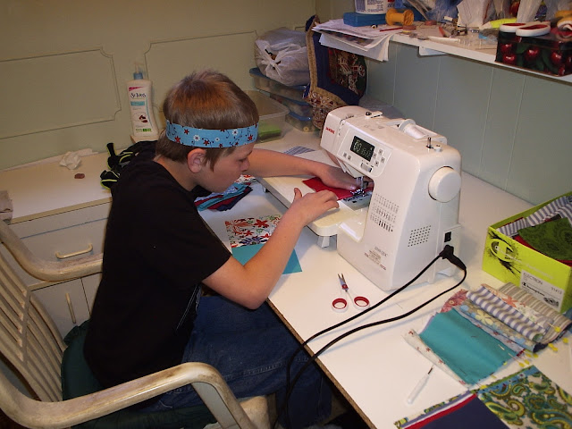 You see the light green shoe box to the right of Janome? This is Russell's quilt box - a project he started soon after I got my machine and it has been waiting for a time when Russell was ready to continue the work and I was willing to give him some time on the machine!