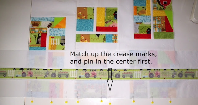 Lay your quilt top face up on your work surface and place the first border with right sides together, match up the crease marks, and pin in the center. Pin along the edge to each corner, matching the raw edges of the quilt top and border.