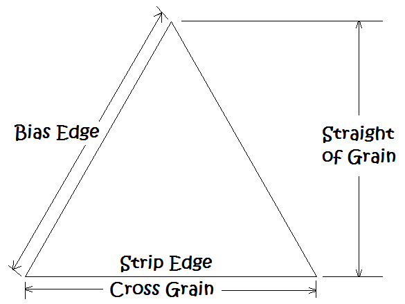 Be careful to keep your triangles piled with the fabric grain running in the same direction. When cutting the triangles from your fabrics strips, the straight of grain is running perpendicular to the top and bottom edges of your strip, and your cuts are on the bias. You want to keep your strip edge, the cross grain, as the bottom of your triangles when piling. The fabric will stretch along the bias sides.