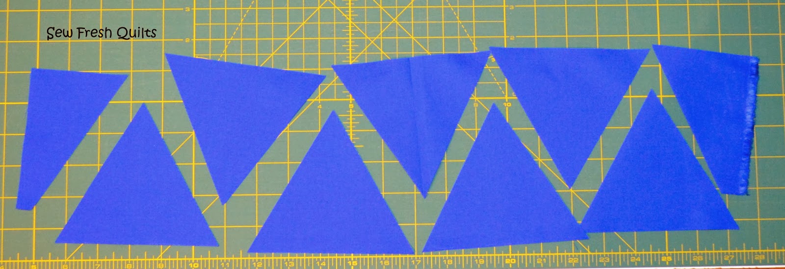 I used two similar methods to cut the strips into the triangles needed for the quilt layout. The first example is cut from WOF (width of fabric) strips measuring between 40" to 44".