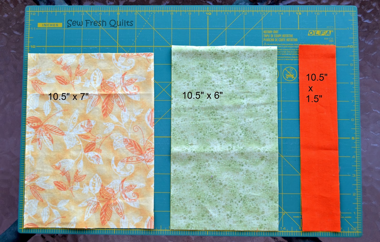 For the pillow case, you will need a 10.5" x 7" piece for the main portion of the case, a 10.5" x 6" piece for the cuff, and a 10.5" x 1.5" piece for the trim.