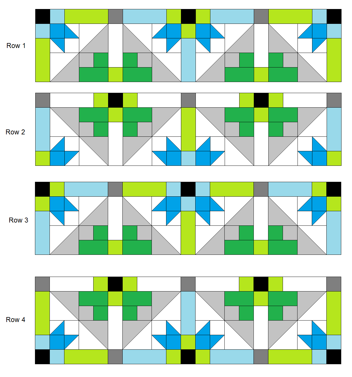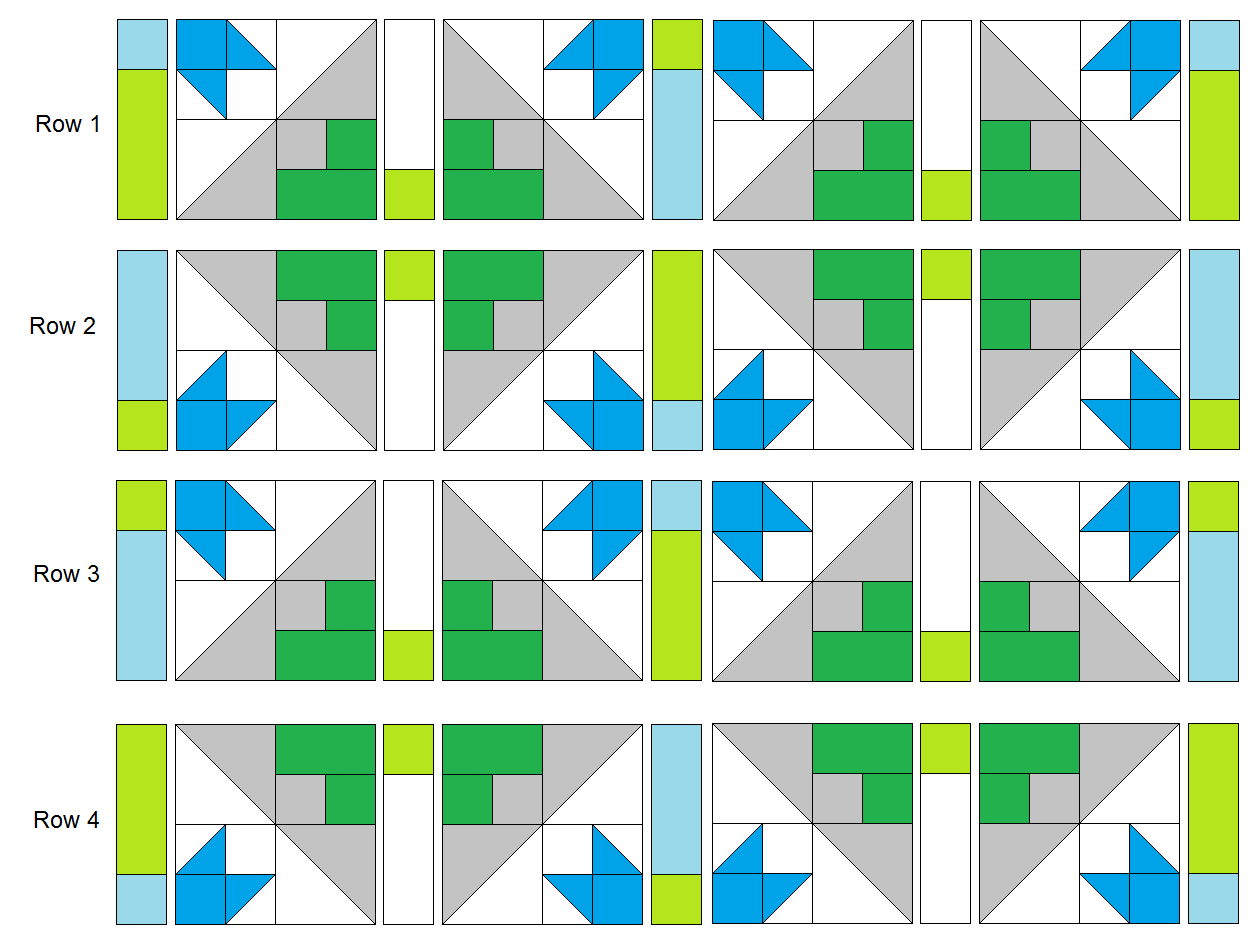 - Arrange these blocks and remaining sashing units to make the Row 1 and sew the pieces into the row. Do the same for the remaining 3 Rows.