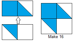 - Use the 16 Cyan and 16 Snow 2.75" squares to make HST units using this tutorial and trimming your 32 HST's to 2.25" square.