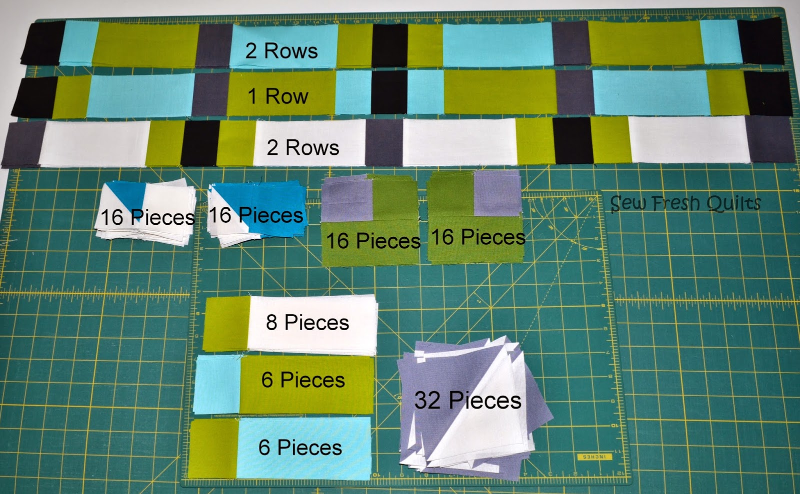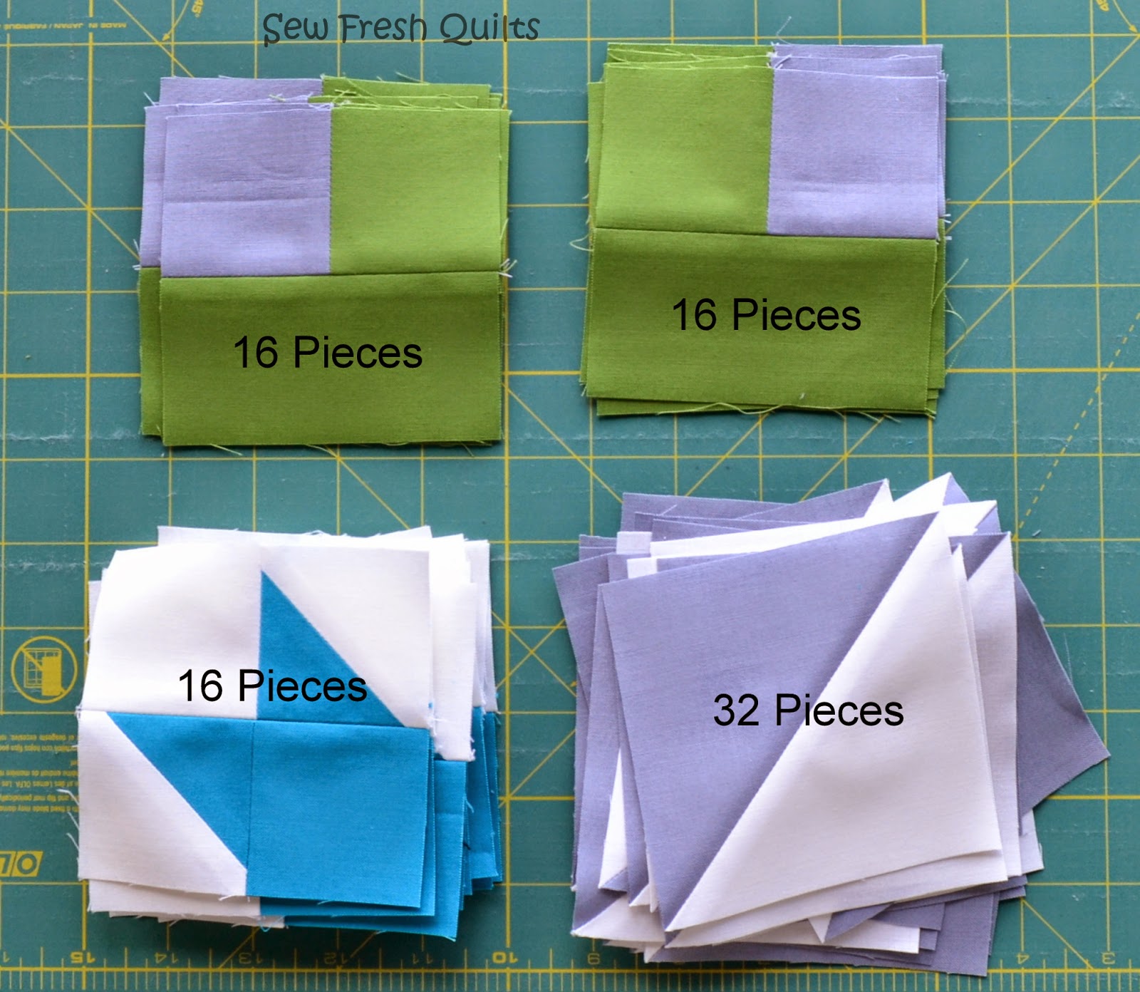 This photo show the pieces needed to make the 16 blocks.