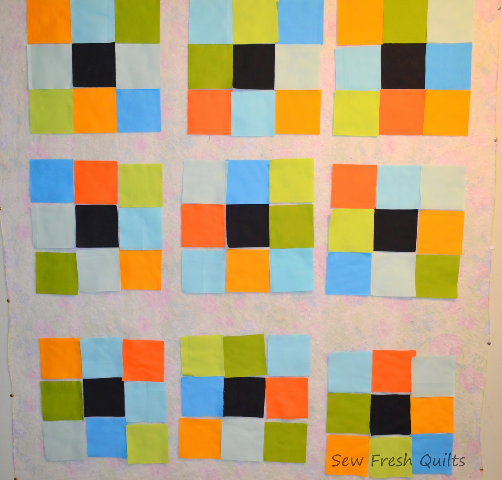 Here are my alternate blocks - nine patches - up on my design wall. These nine patch blocks and the GO! Ohio Star blocks are a 12" finished size.