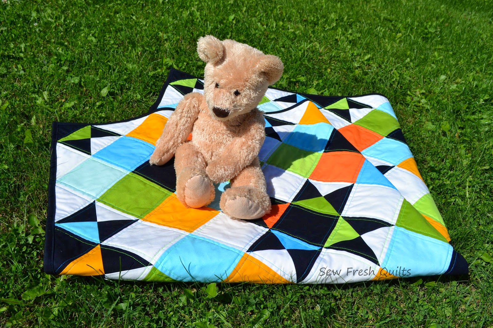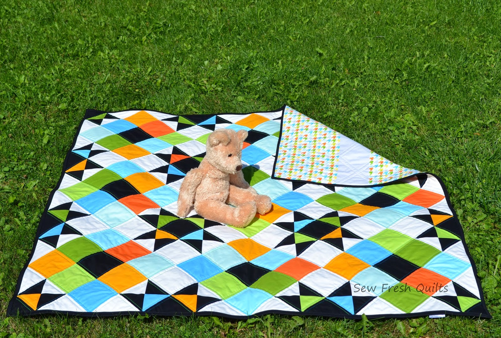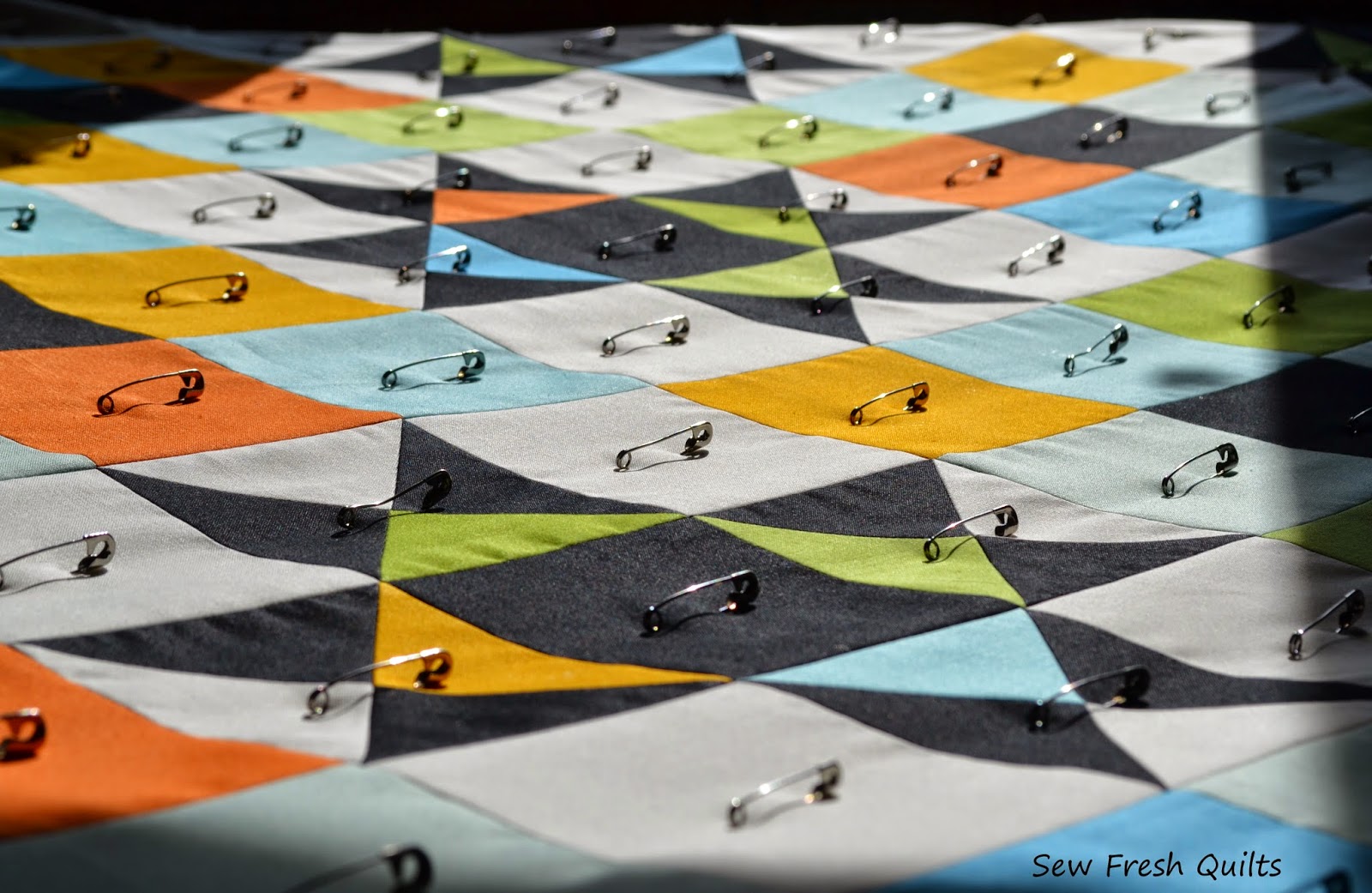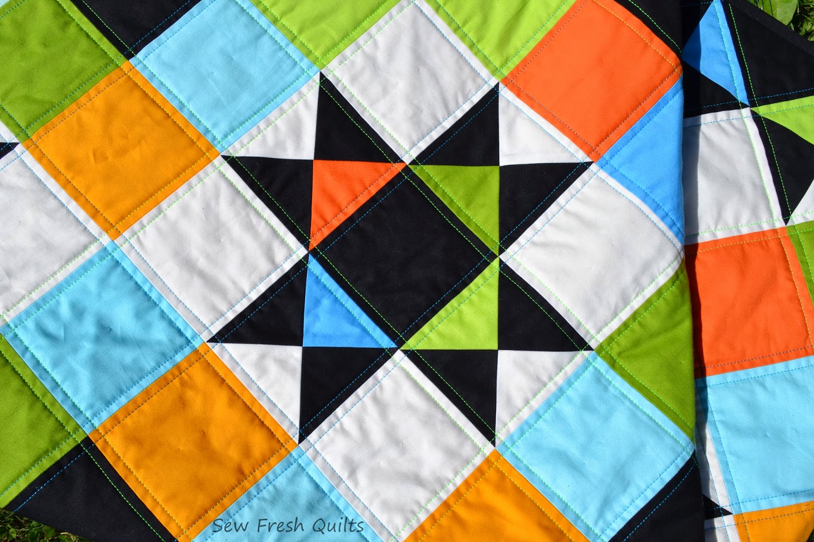 I wanted to emphasize this on point design, so on Tuesday I quilted along the diagonal seams using Magnifico from Superior Threads, in Aruba and Electric Green. By Tuesday night, this project was quilted, trimmed and bound! This is project #11 in my quilt label countdown from 100.