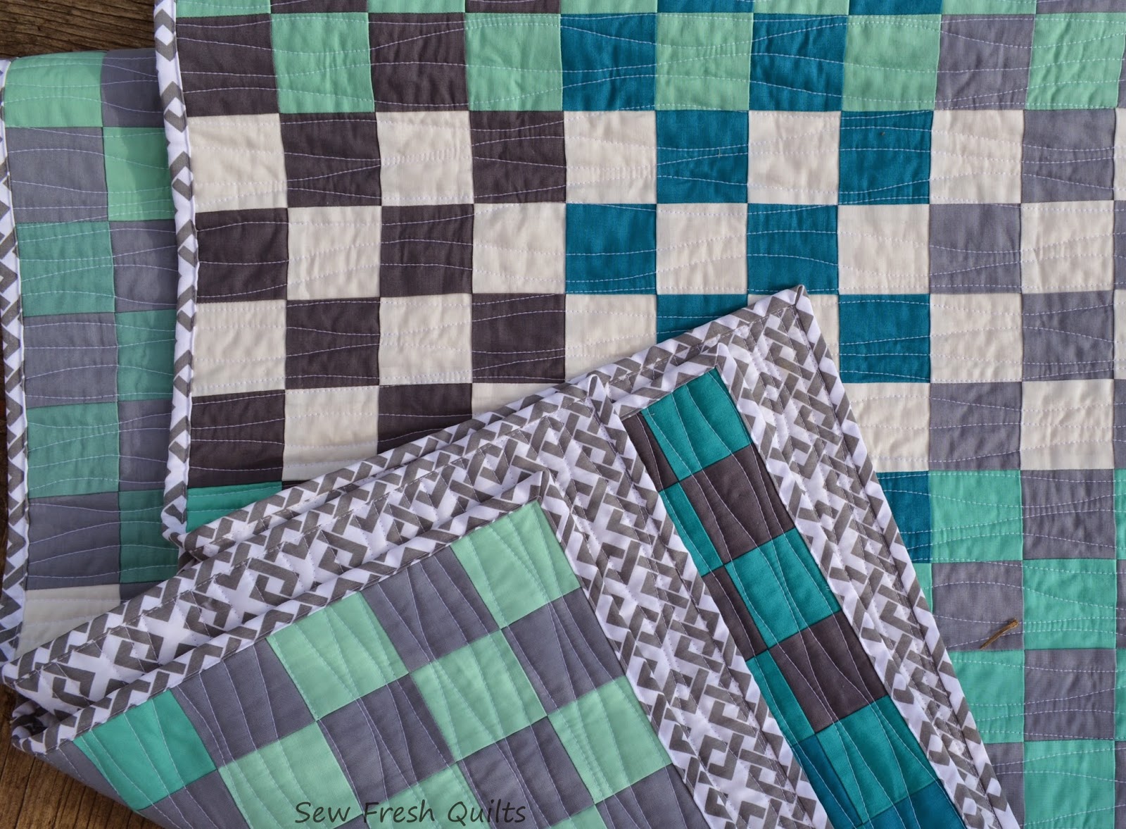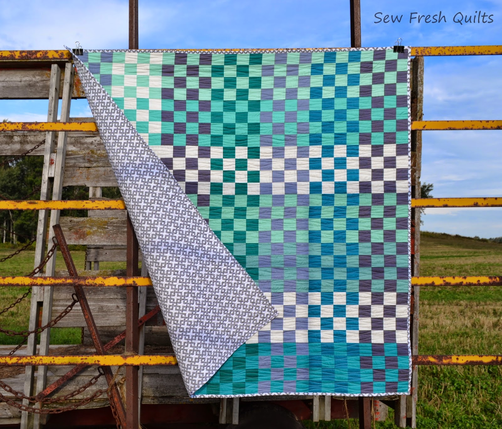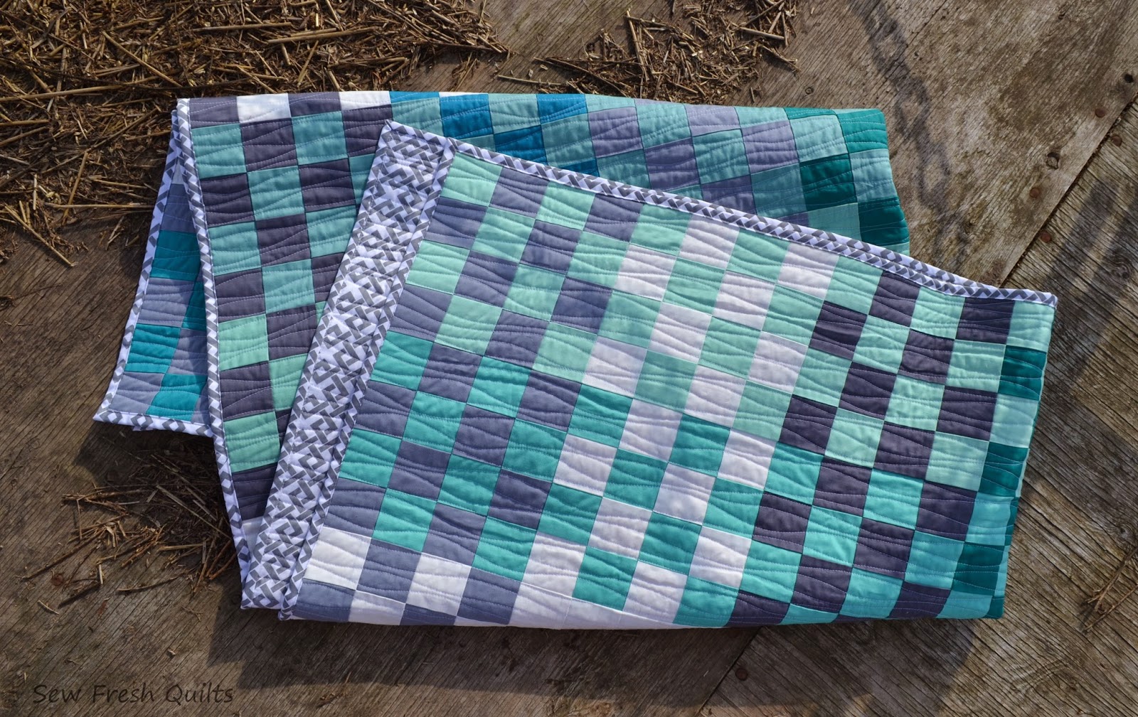 Using 8" finished size blocks, the Pretty in Plaid quilt finished at approximately 54" x 54" after quilting, and is a nice sized lap quilt. The quilt top was made entirely of Kona Cotton Solids: Caribbean, Jade, Emerald, Candy Green, Aloe, Pond and Sage along with Coal, Medium Grey and Snow.