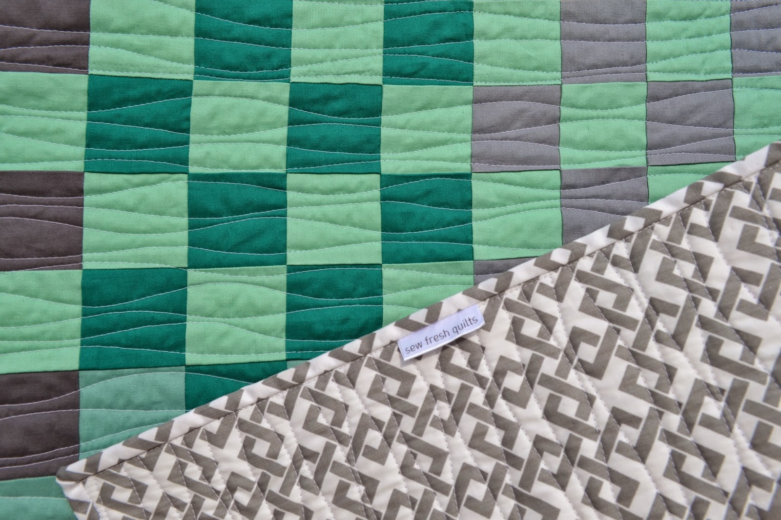Finished with my new fave quilting style.... Organic wavy lines from edge to edge. The backing was a new sheet, a geometric print in grey and white, also used for the binding.