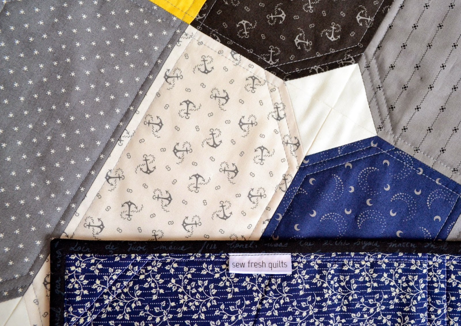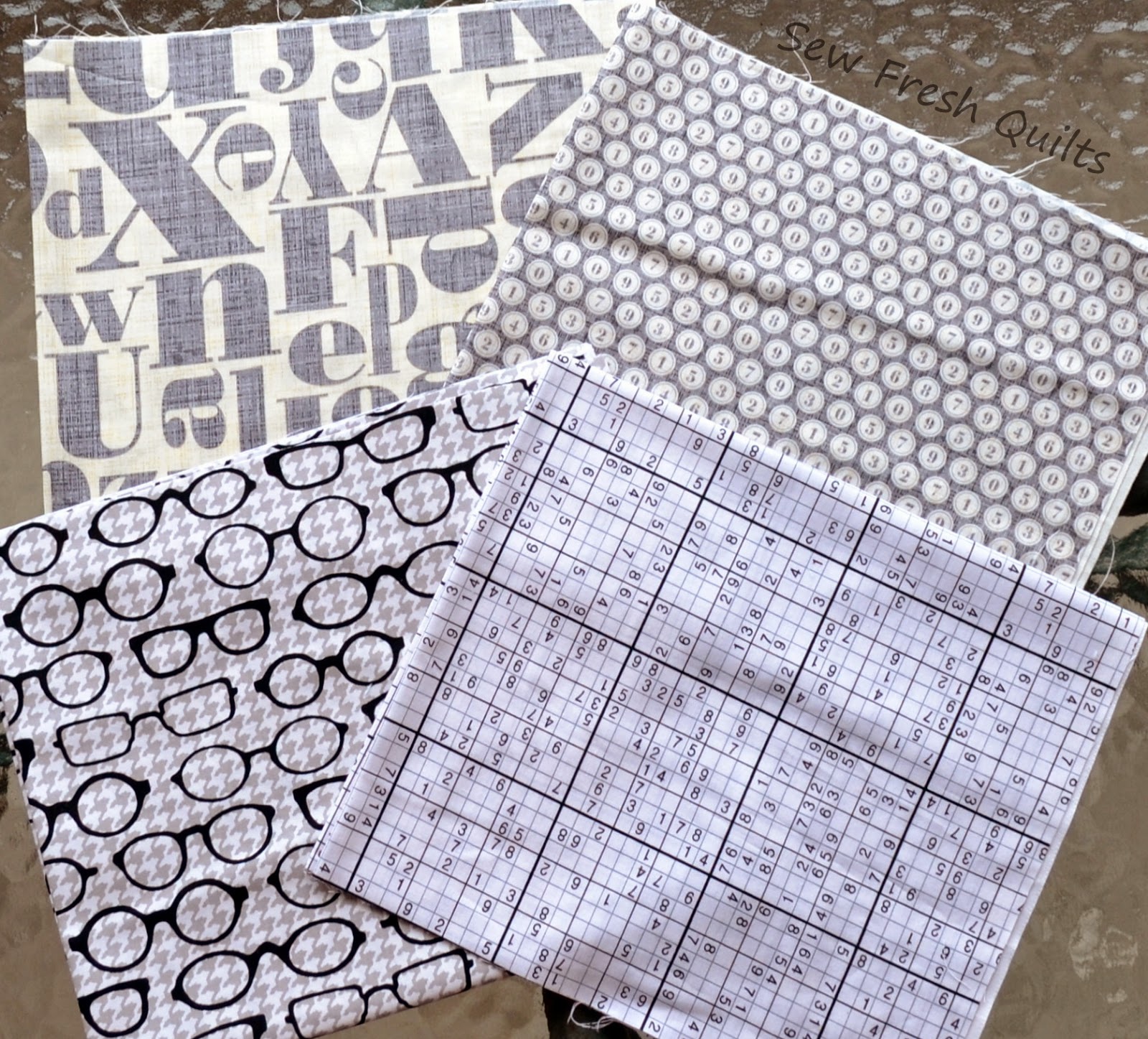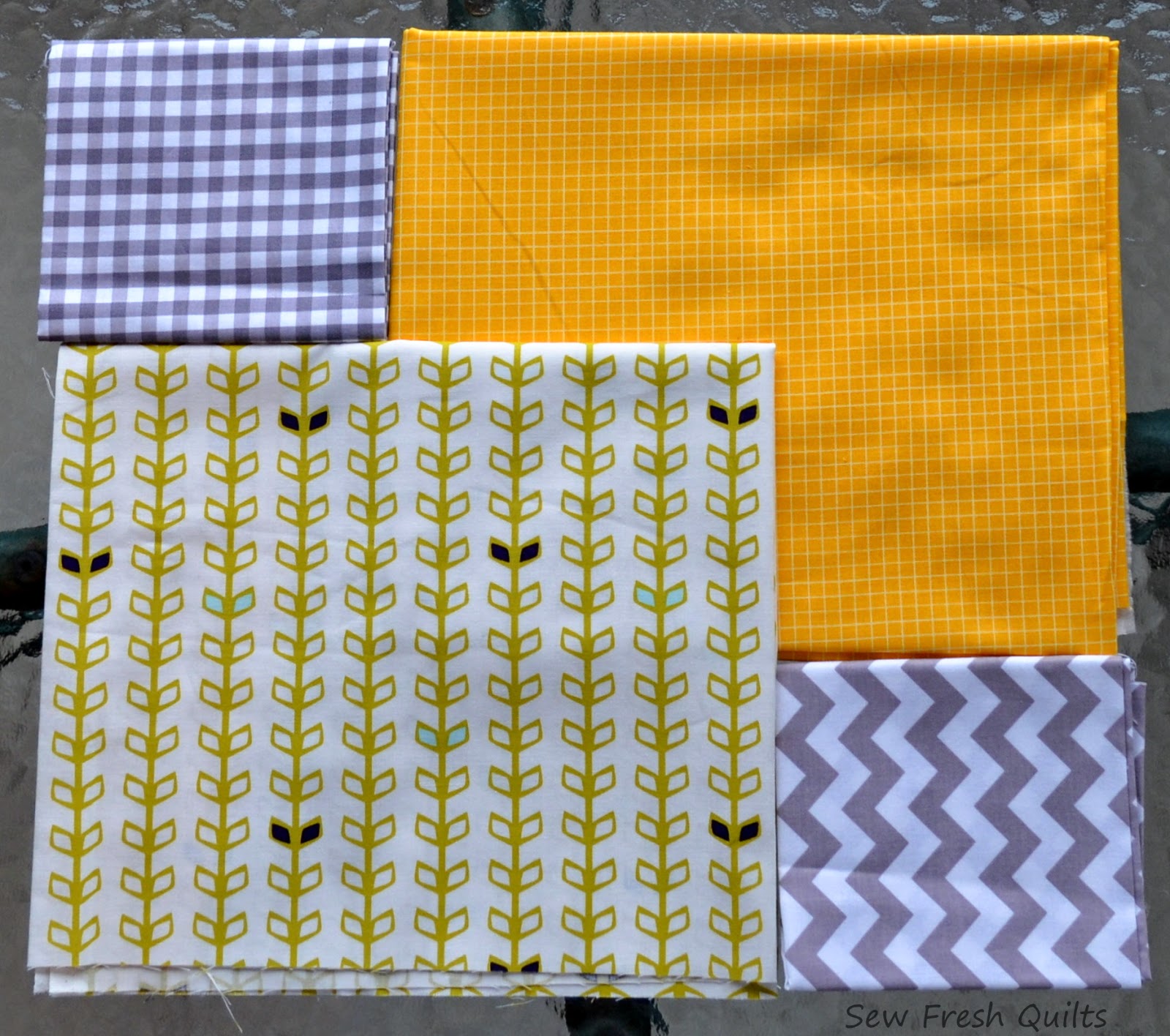 Left to right, Top to Bottom: Riley Blake Medium Gingham in Grey, Best Day Ever Graph Paper in Saffron, Fruit Stand Vines in White, and Riley Blake Medium Chevron in Grey,.