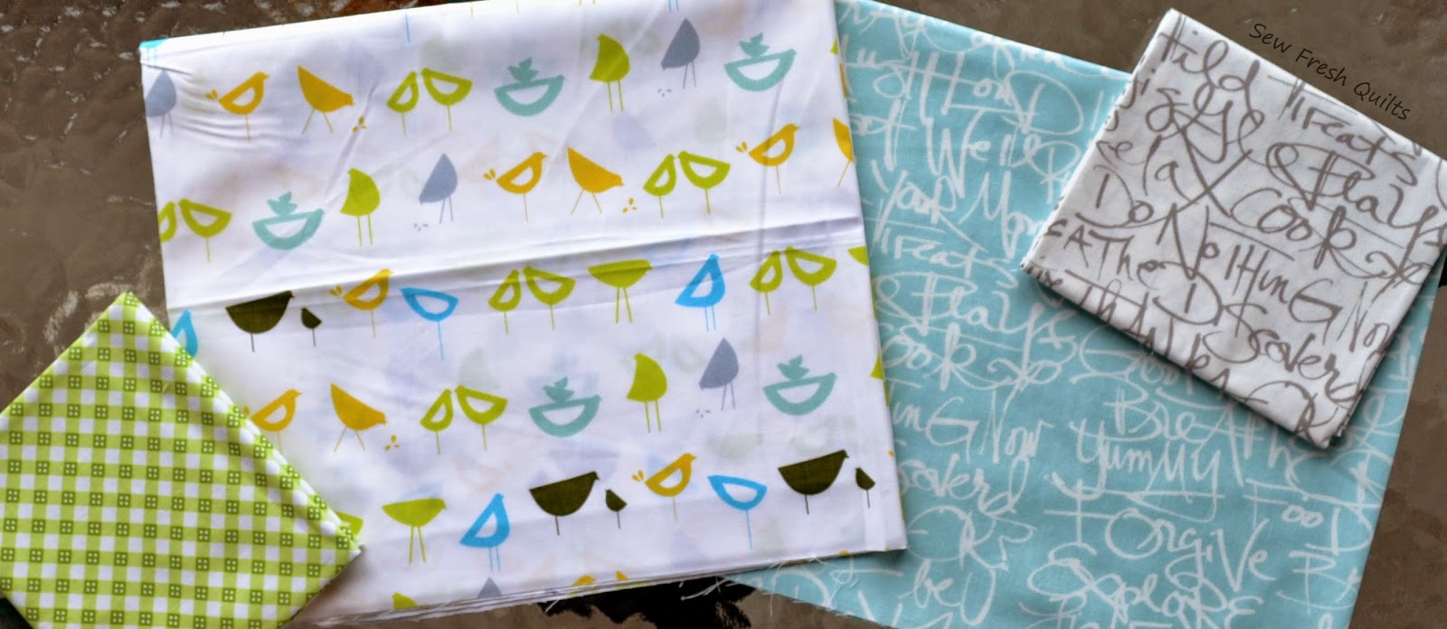 Left to right: Hello Sunshine Plaid in Green, Havana Little Birds in Blue, ColorFULL Text in Aqua and Text in Grey.