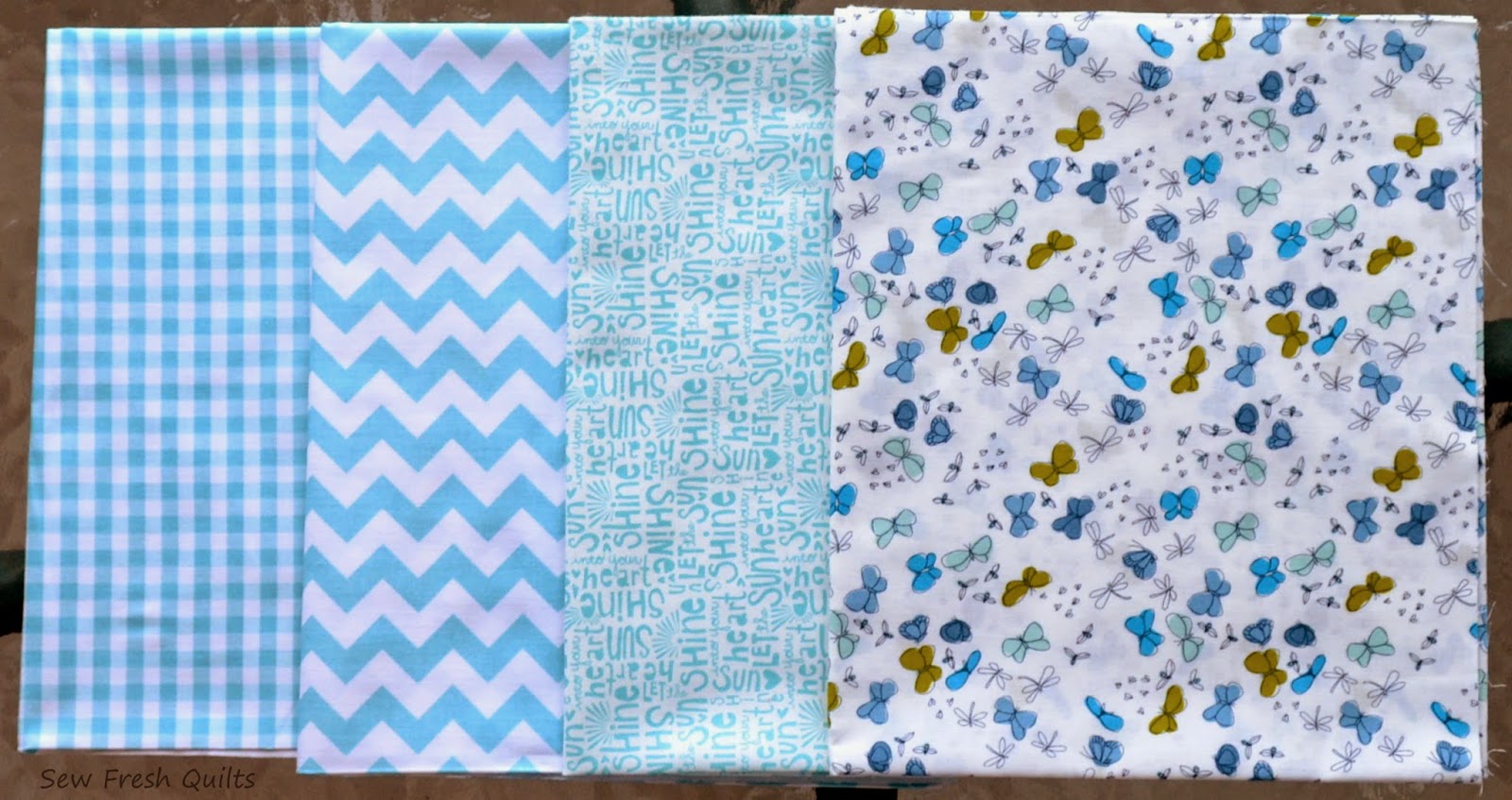 Left to right: Riley Blake Medium Gingham and Small Chevron, Sunnyside Text, and Arcadia Flutterflies - all in Aqua.