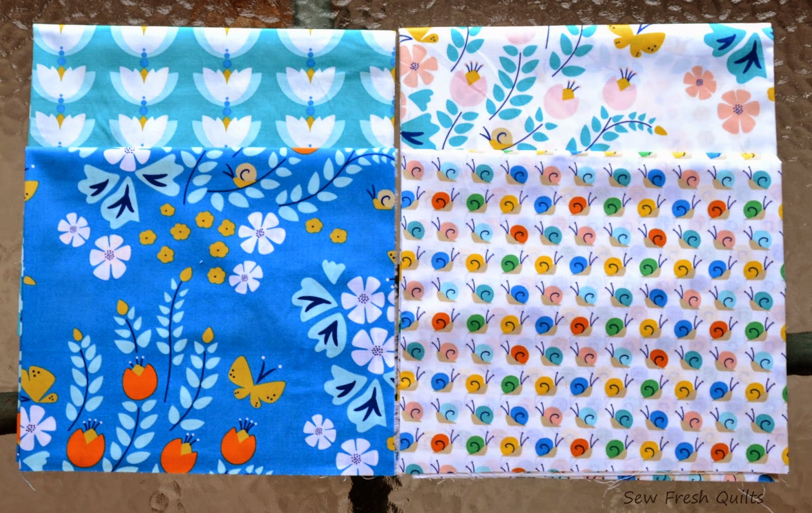 Left Top to Bottom: From the Bluebird Park collection: Woven Floral in Fountain, Hedgehogs in Tangerine, Woven Floral in Grass, and on the right is Lamp Post in Stone.