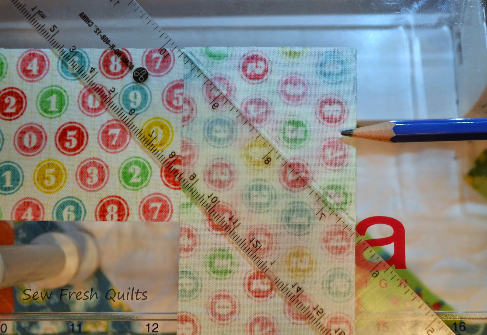Sew along this diagonal seam line from the corner of your top strip to the corner of your bottom strip.