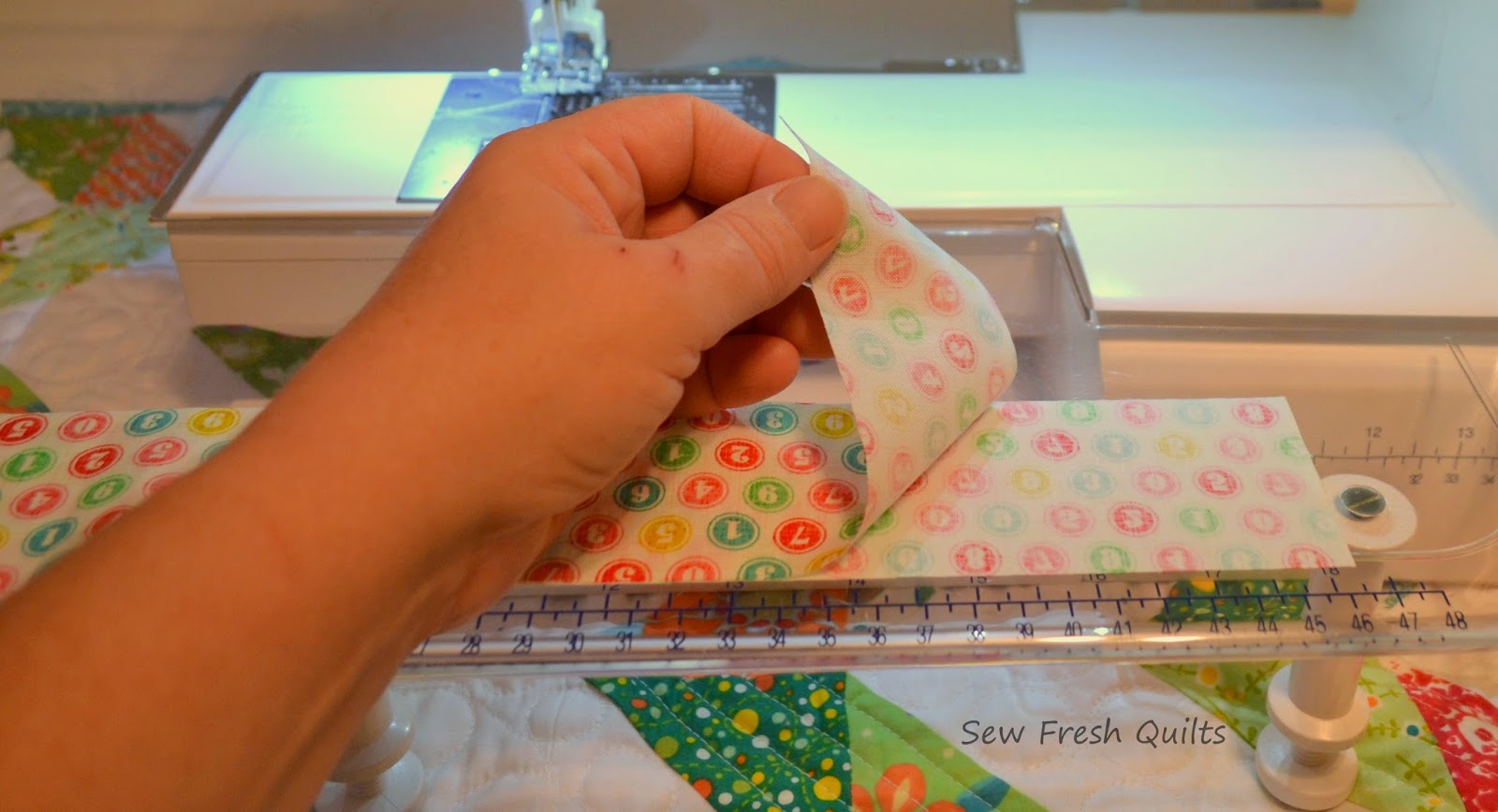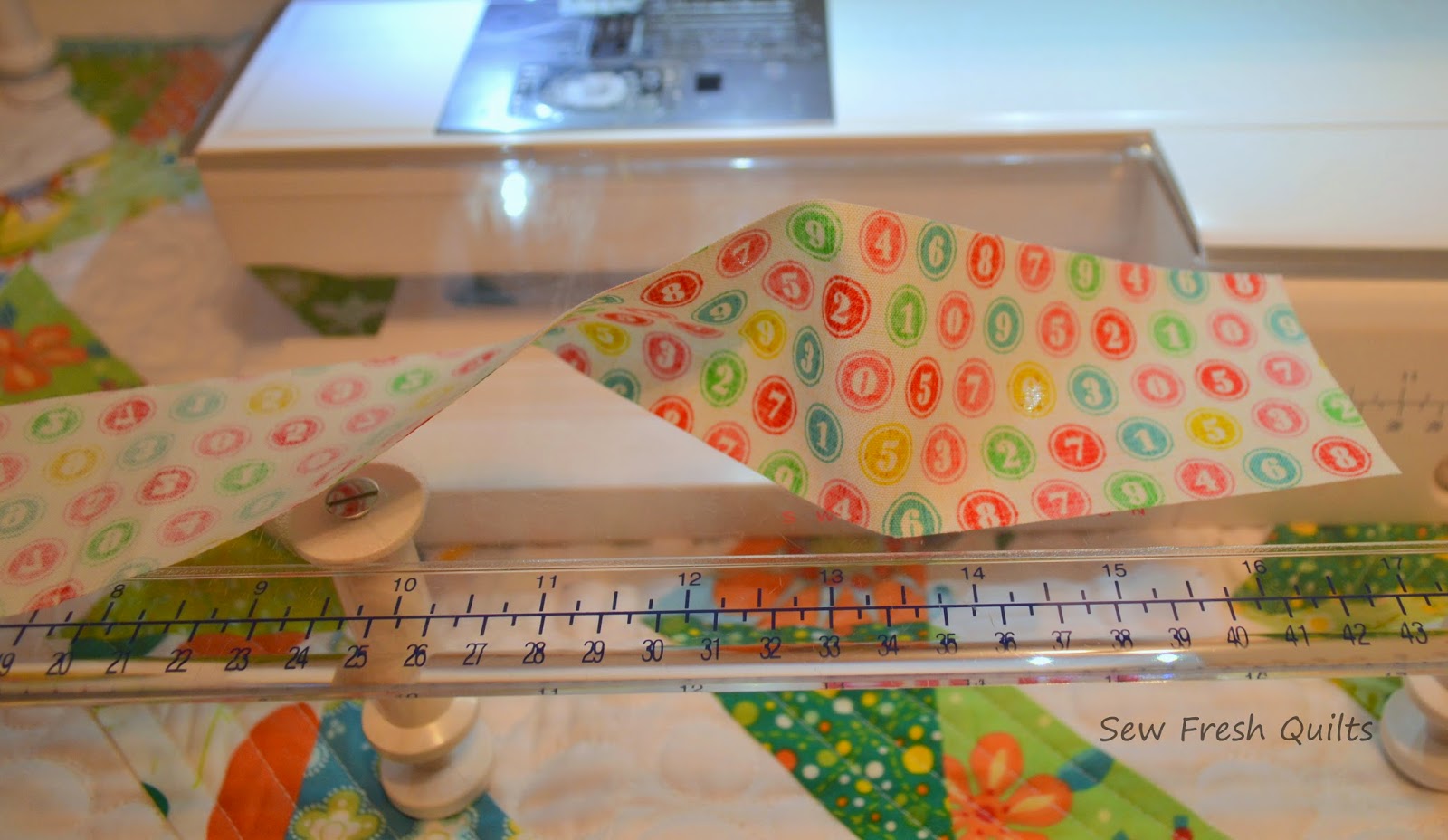 For someone just starting out with machine finished binding, I recommend cutting your strips 2.5" wide, as you would for a hand finished binding. After you have some experience, try cutting your strips 2.25" wide. This will result in a finished binding that is more even in width on the front and back of your quilt. And if finishing with the topstitching method, the seam line will lie closer to the binding on the back of the quilt.