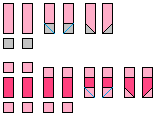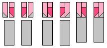 Step 1: Take 2 Background @ 1.5" squares and place them on the bottom ends of 2 Light Pink @ 1.5" x 3.5" rectangles. Sew along the diagonal and trim 1/4" seam. Press the seams open. Take 2 Light Pink @ 1.5" squares and sew them onto the ends of 2 Dark Pink @ 1.5" x 2.5" rectangles. Take 2 more Light Pink @ 1.5" squares and place them on the bottom ends of the Dark Pink rectangles. Sew along the diagonal and trim 1/4" seam. Press the seams open.