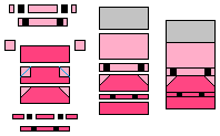 Step 4: Take 2 Light Pink @ .75" x 1.25" rectangles, 2 Black @ 1.25" squares and 1 Light Pink @ 1.25" x 2.5" rectangle. Sew them together and press the seams open. Also take 2 Light Pink @ 1.5" squares and place them on the top corners of 1 Dark Pink @ 2" x 4.5"