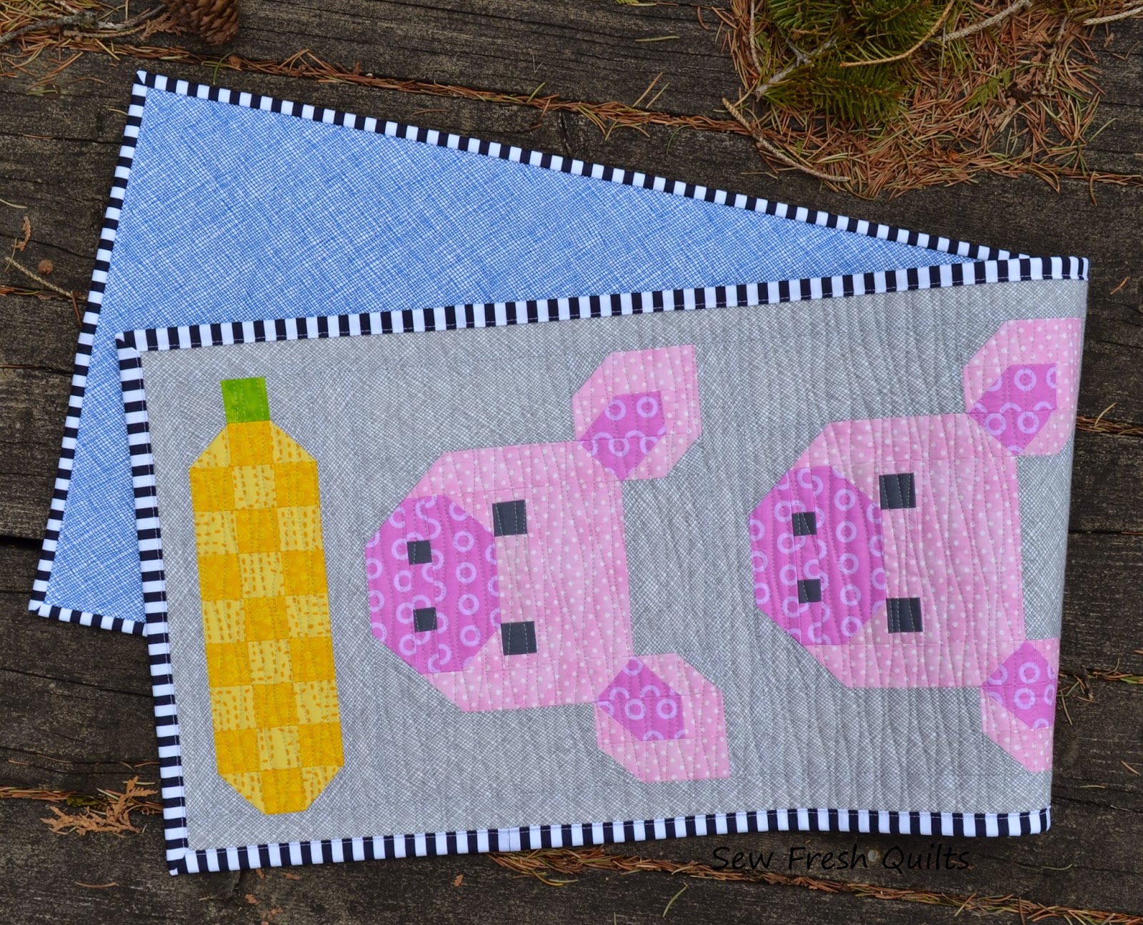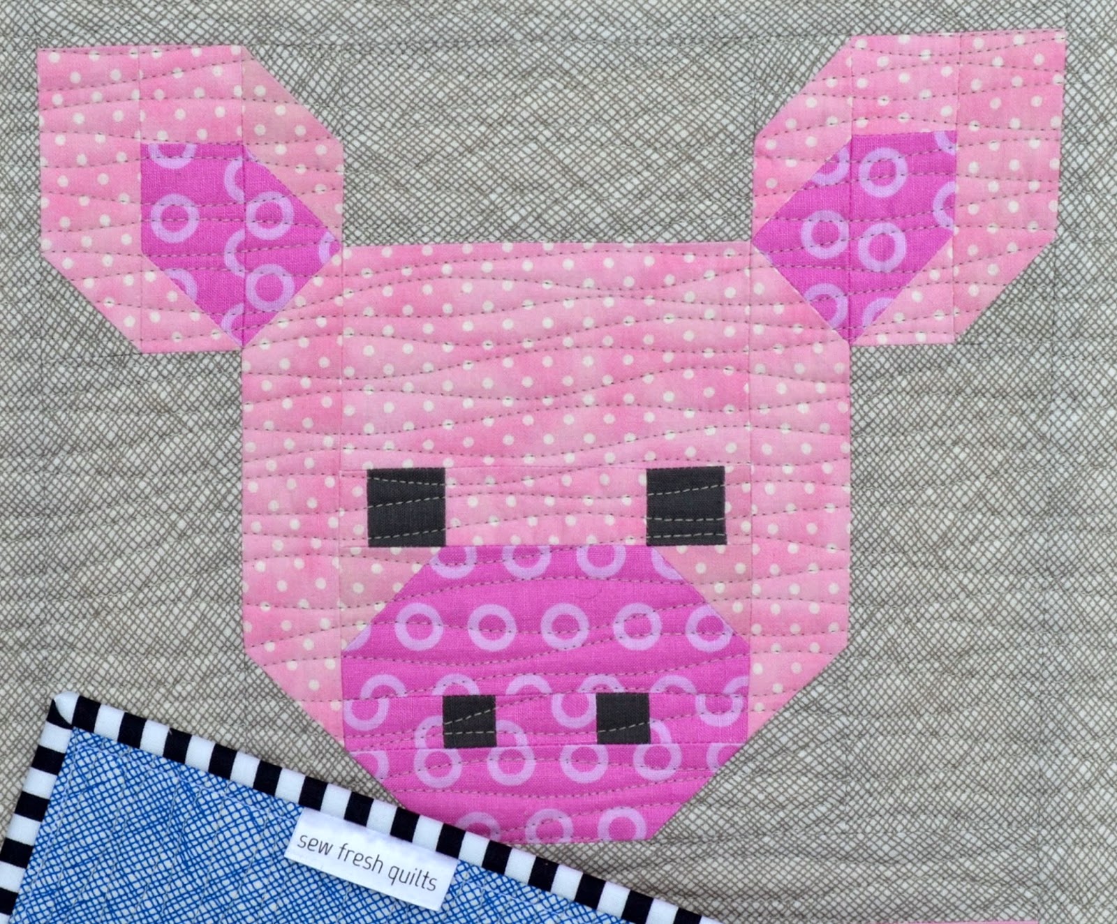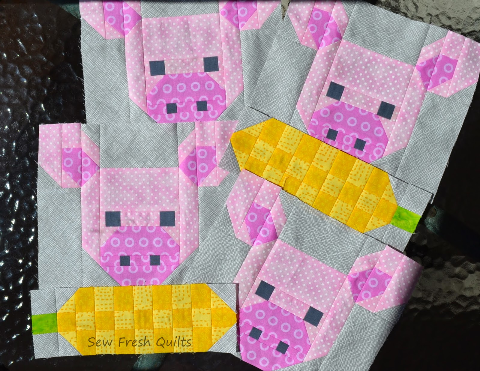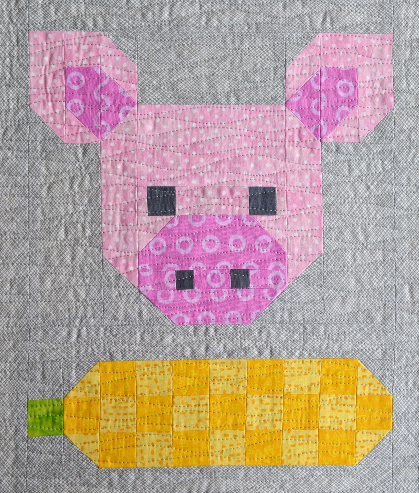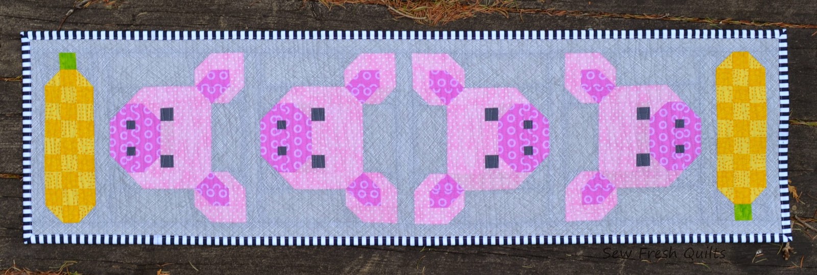 Here are some suggestions for uses of the Pretty Piggy quilt block, with or without the Corn Cob block. Make a cute little mug rug or hot pot mat, place mats or a table runner. Even a wall hanging for your kitchen.