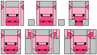rectangle. Sew along the diagonal and trim 1/4" seam. Press the seams open. For the nostrils, take 3 Dark Pink 1" x 1.5" rectangles and 2 Black @ 1" squares. Sew them together and press the seams open. To make the face unit, take 1 Background @ 2.5" x 4.5" rectangle, 1 Light Pink @ 2.75" x 4.5" rectangle, the parts made in the beginning of this step and 1 Dark Pink @ 1.5" x 4.5" rectangle. Sew them together and press the seams open.