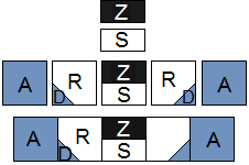 Step 7: Sew (Z) and (S) together. Sew the (ZS) between the (RD) pieces made in the previous step. Sew the (A) squares on the ends.
