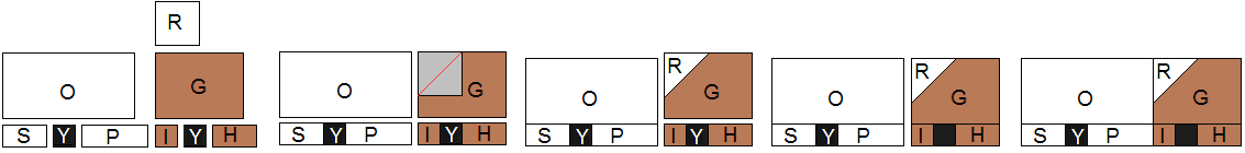 Step 3: Sew (S), (Y) and (P) together AND (I), (Y) and (H) together. Draw a diagonal line across wrong side of the (R) square, place it right sides together on the corner of the (G) rectangle and sew along the diagonal line, as shown in red. Trim a 1/4" seam and press open. Sew the (O) rectangle on top of (SYP) and the (RG) rectangle on top of (IYH). Sew the two pieces together.