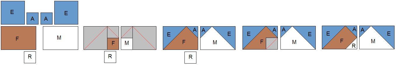 Step 1: Draw a diagonal line across wrong side of the (A) and (E) squares, place them right sides together on the corners of the (F) and (M) rectangles and sew along the diagonal lines, as shown in red. Trim a 1/4" seam and press open. Draw a diagonal line across wrong side of the (R) square, place it right sides together on the corner of the (F) rectangle and sew along the diagonal lines, as shown in red. Trim a 1/4" seam and press open.