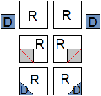 Step 6: Draw a diagonal line across wrong side of the (D) squares, place them right sides together on the corners of the (R) squares and sew along the diagonal lines, as shown in red. Trim a 1/4" seam and press open.