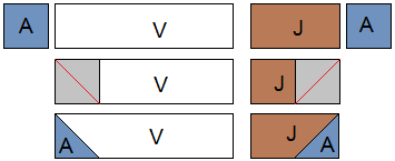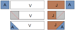 Step 5: Draw a diagonal line across wrong side of the (JA) piece made in the previous step, place it right sides together on the end of the (AV) rectangle and sew along the diagonal lines, as shown in red. Trim a 1/4" seam and press open.