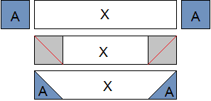 Step 5: Draw a diagonal line across wrong side of the (A) squares, place them right sides together on the ends of the (X) rectangle and sew along the diagonal lines, as shown in red. Trim a 1/4" seam and press open.