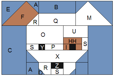 Step 4: Sew (I), (Y) and (I) together. Sew the (HH) rectangle on top of (IYI) and the (S) rectangle on the right side. Sew the (U) rectangle on top. Sew the piece made in the previous step to the left side.