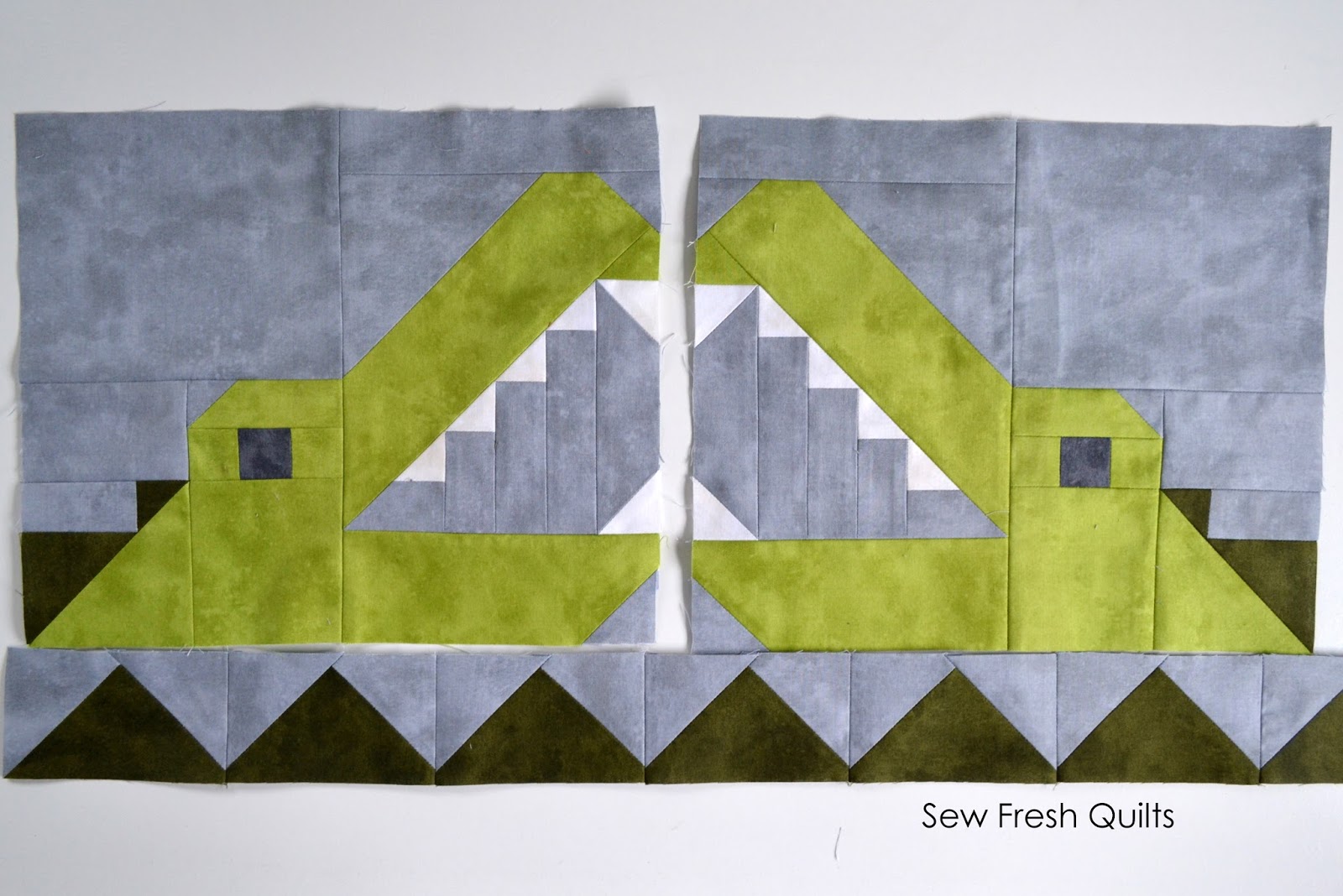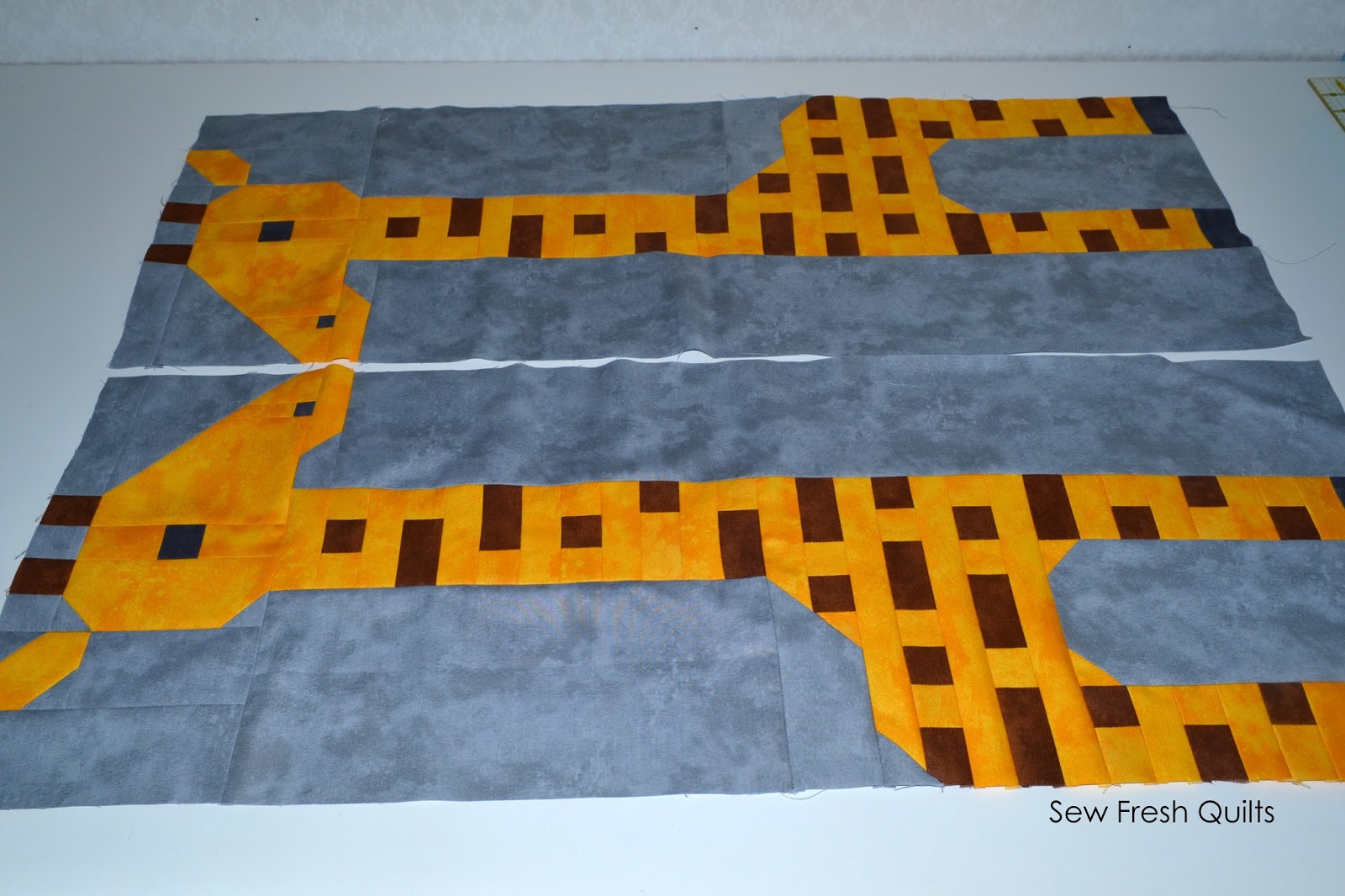 The Jungle Friends quilt pattern consists of the following sized quilt blocks: Monkey 8” wide x 7” high, Zebra 12” wide x 14" high, Elephant 12” wide x 10" high, Giraffe 12” wide x 34" high, Male Lion 12” wide x 12" high, Female Lion 10” wide x 9" high, Crocodile 12” wide x 10" high, and the Hippo blocks finish at 12” wide x 6” high. This allows for a variety of settings in which your blocks can be used to make cushions, place mats, table runners, wall hangings or quilts from baby to big. Adding wider sashing and borders will also help you to adjust this pattern up to the size you desire.| Monkey and Zebra Blocks |