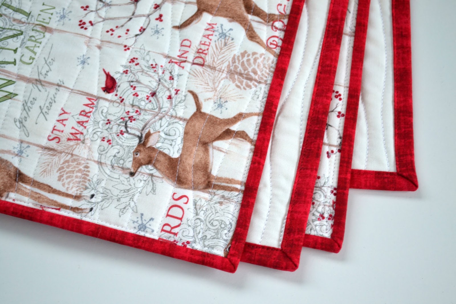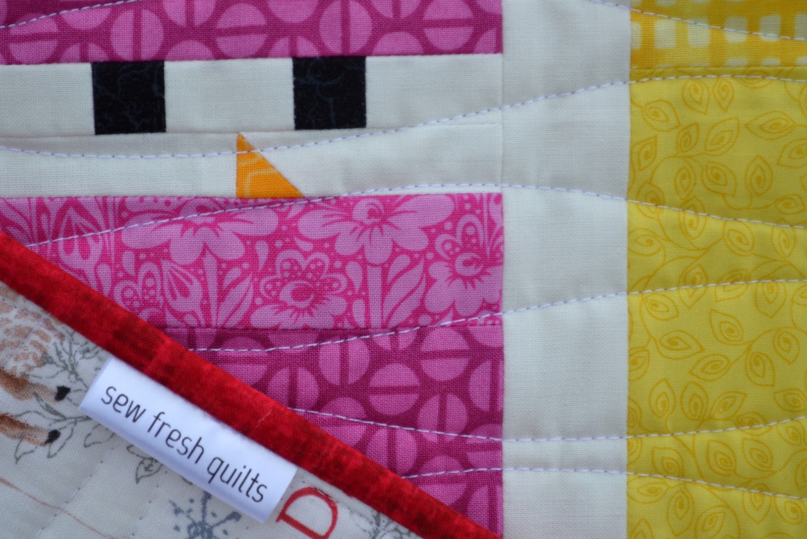 The binding was left over from my Canada 150 quilt. It really makes me think of Christmas and it goes so well with the backing. It also matches a few places I used it in the blocks, like for Santa's hat, the big bow and the Cardinal's wing.