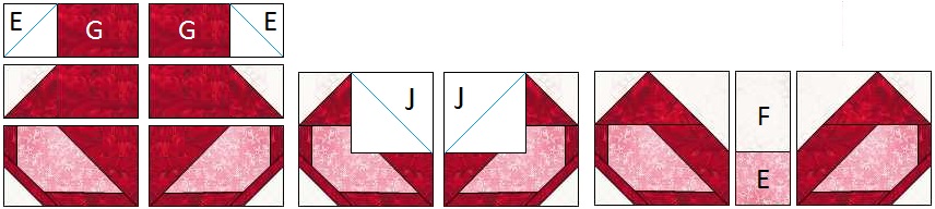 Step 2: Use the STOP method to add the White (E) square on the Dark Bow (G) rectangle. Make one facing left and one facing right. Sew these onto the top of the units made previously. Use the STOP method to add the White (J) squares. Sew the White (F) rectangle to the Light Bow (E) square. Arrange the units and sew together.