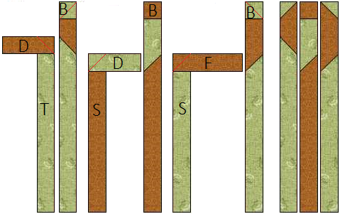 Step 6: Use the STOP method to add the Brown (D) to the Background (T) rectangle then to add the Background (B) square. Use the STOP method to add the Background (D) rectangle to the Brown (S) rectangle then add the Brown (B) square to the top. Use the STOP method to add the Brown (F) rectangle to the Background (S) rectangle then to add the Background (B) square. Sew these units together.