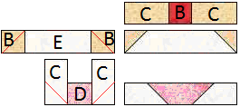 Step 2: Sew the Red (B) square between the Beige (C) rectangles. Use the STOP method to add the Beige (B) squares on the corners of the White (E) rectangle. Use the STOP method to add the White (C) rectangles on the ends of the Pink (D) rectangle.
