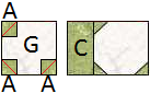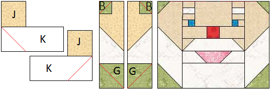 Step 4: Use the STOP method to add the White (K) rectangles to the Beige (J) rectangles. Use the STOP method to add the Background (B) and (G) squares. Sew these onto the sides of the unit made previously.