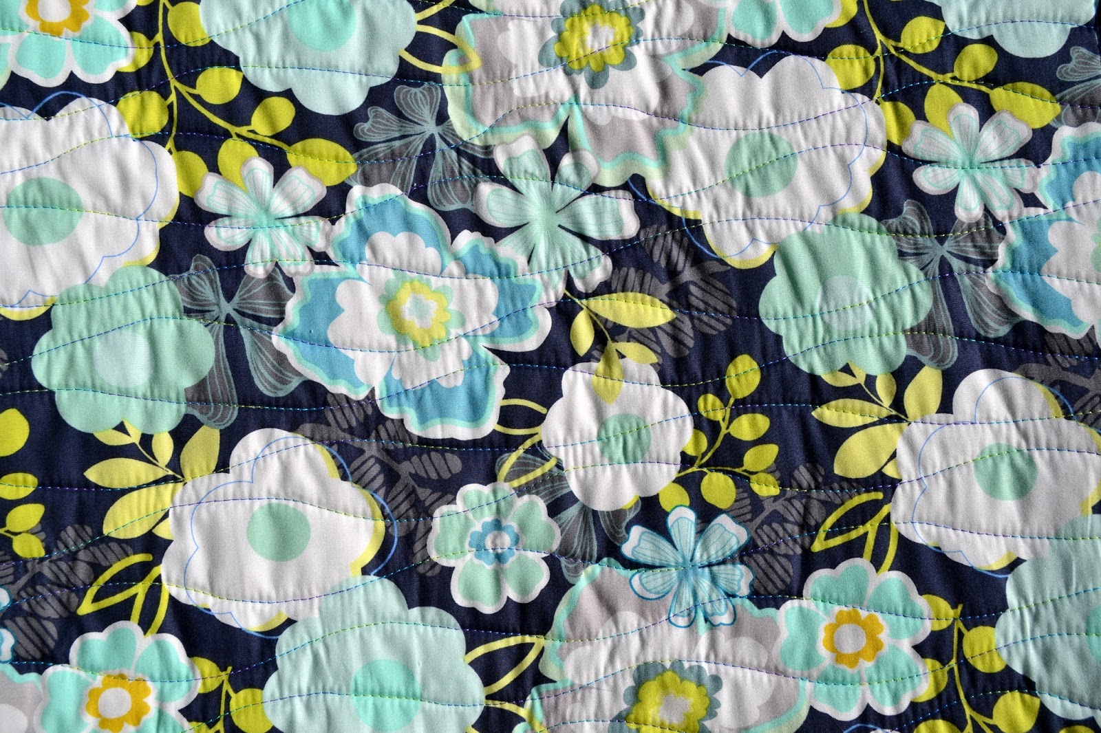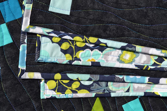 Of course, the quilting is my usual organic wavy lines using my walking foot. I chose a blue/green/purple variegated thread from Superior Threads for this, both on top and in the bobbin and I opted to bind using the backing fabric.