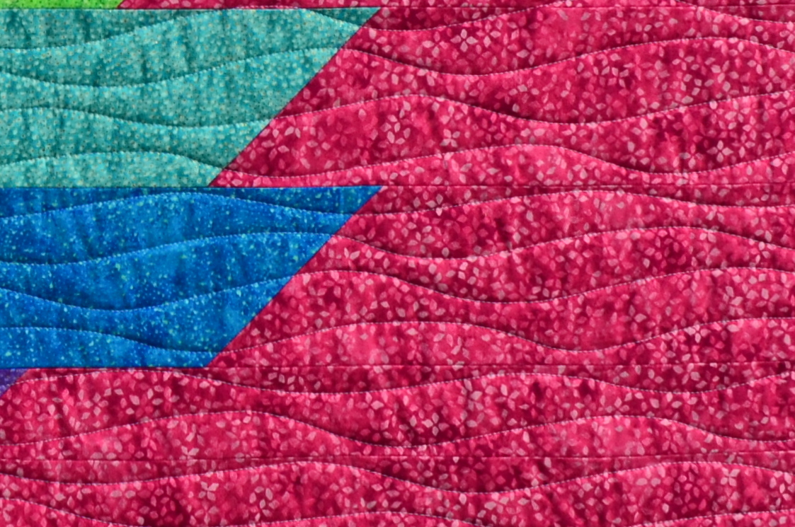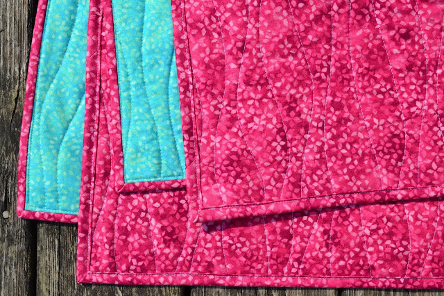 I normally cut my binding strips while doing all the other cutting. But this time I waited until the top was pieced to allow some time for thought. In the mock ups, I had used the purple to show the binding, but I decided to use the background fabric and blend in rather than outline. And I think the hot pink looks great against that aqua print used for the backing.