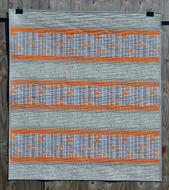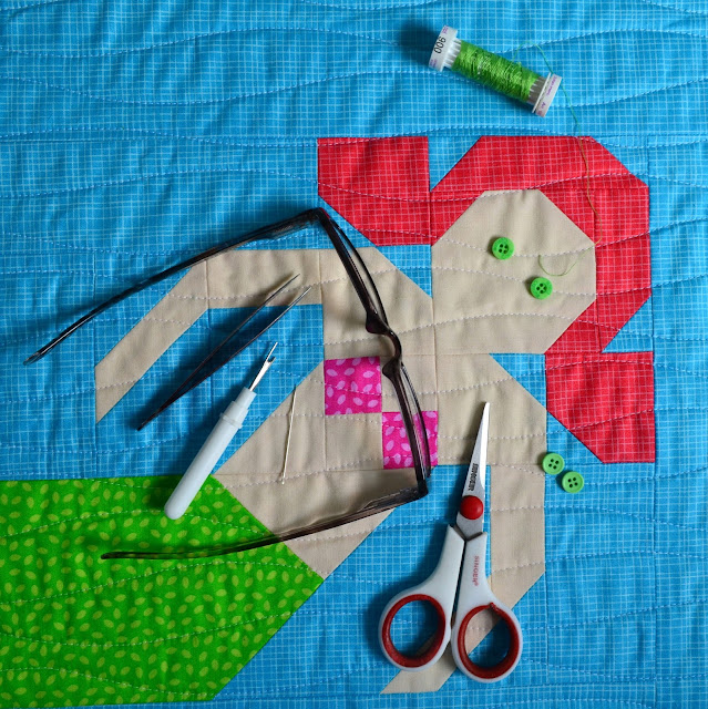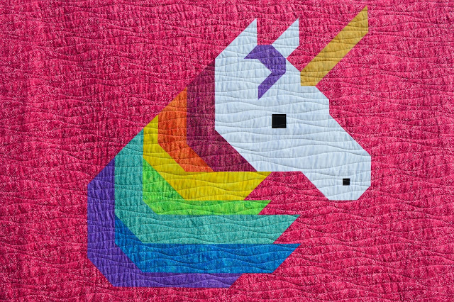 The quilting was performed using my walking foot to create organic wavy lines with white thread both on top and in the bobbin. And I like how the quilting stands out a little more than if I had used a matching pink. Plus it blends well with all the other colours too, so we don't have pink stripes running across that white unicorn face.