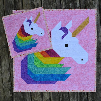 The Rainbow Unicorn pattern provides instructions for three sizes. The blocks are 10" 20" and 40" square and finish at 12", 24" and 48" square including the borders.