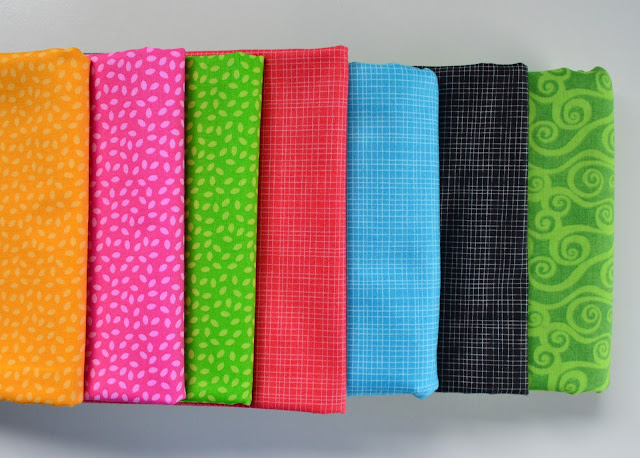 I ordered my fabric from Sew Sisters Quilt Shop. I chose Sprinkles Yellow (hair), Pink (bikini tops) and Green (tails) from the Boutique Brights collection for RJR Fabrics, Woven in Ruby (hair), Sapphire (background) and Black (hair) from the Mixology collection by Camelot Fabrics and a 108" wideback Swirly Scroll in Lime from the Essential collection from Wilmington Prints for the backing.