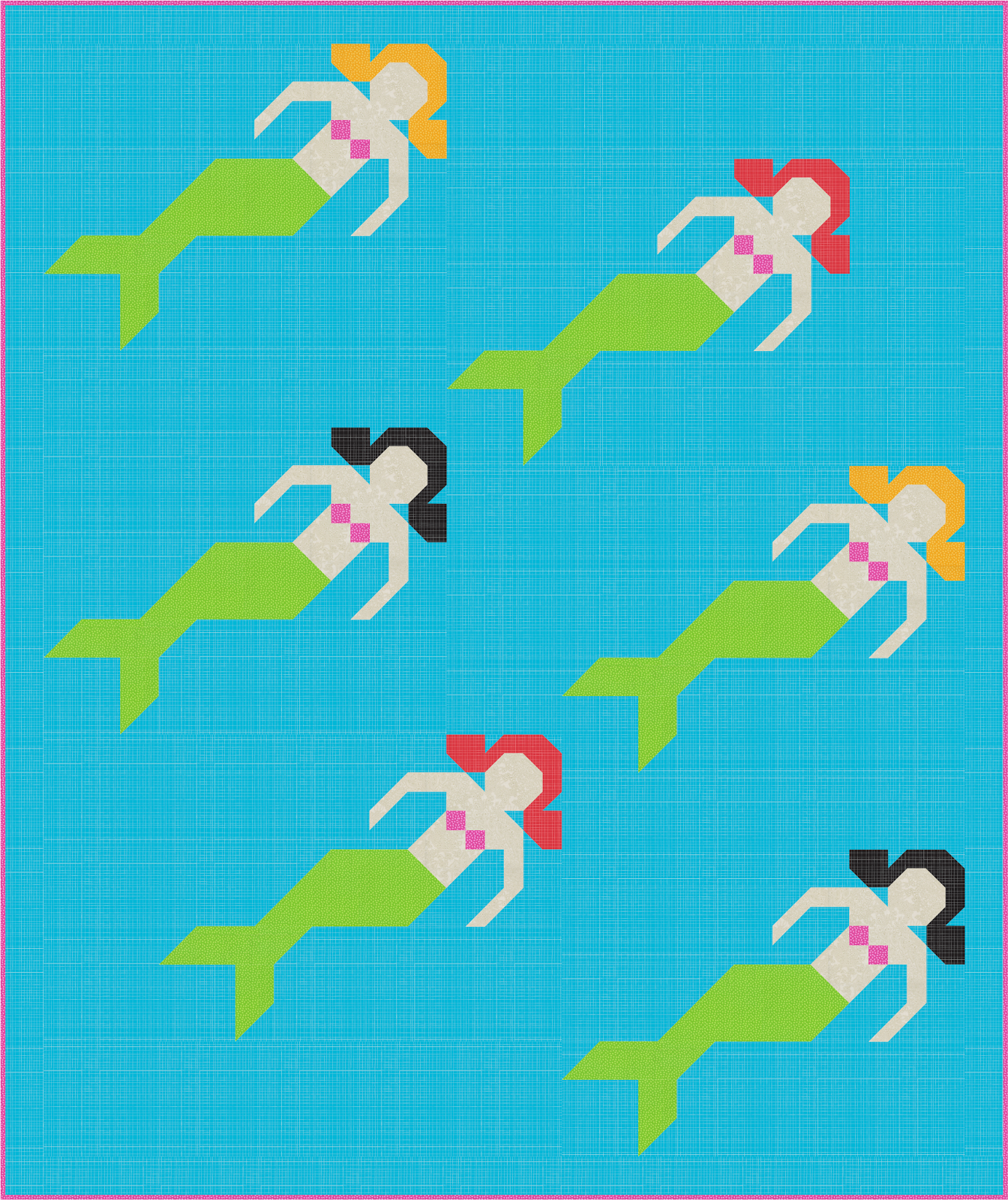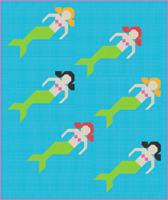 Although I have managed to write the pattern, it's still in the testing phase. The quilt blocks finish at 18" x 21" and can easily be made with either the long or short hair versions. And the quilt finishes at 52" x 62" using 6 mermaid blocks.